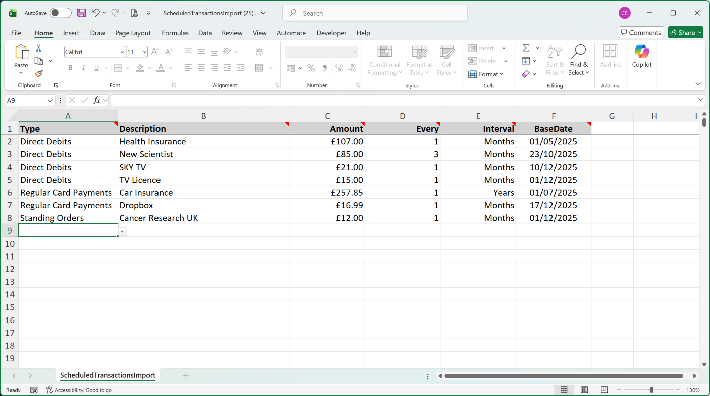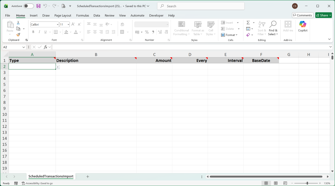 For those users skilled in manipulating data using Excel it might be possible to use a download of transactions from your banking app to populate this template. Or, some users might find it more convenient to use this template rather than using the Scheduled Transactions form.