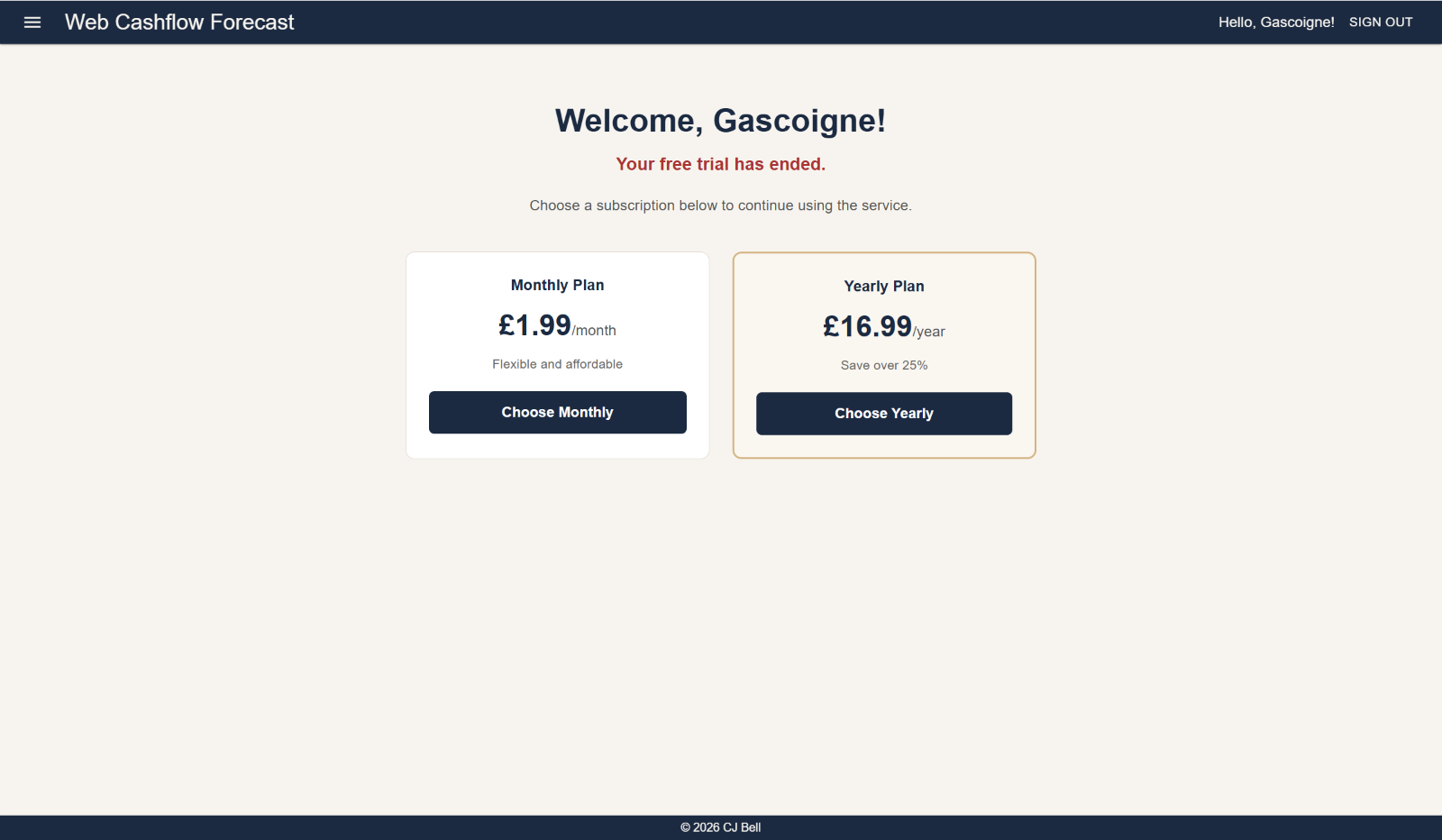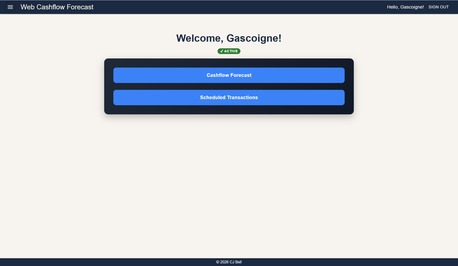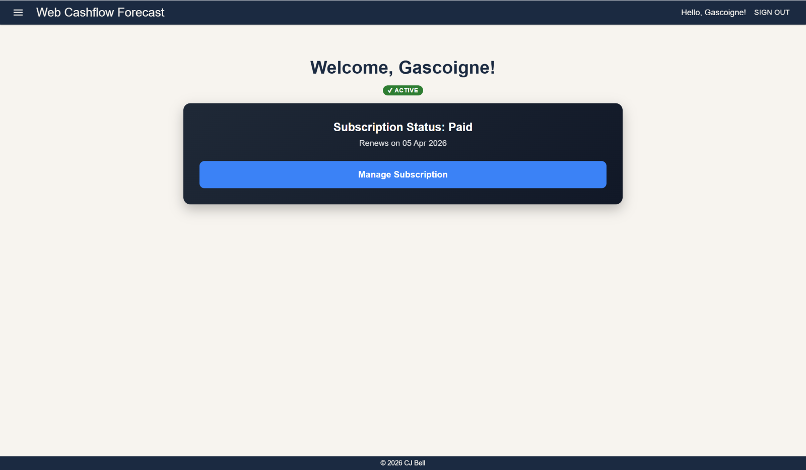 From now on, whilst you have a valid subscription, when you sign in you will be directed to the 'active subscription' page which has short-cut buttons to the two main pages, 'Cashflow Forecast' and 'Scheduled Transaction'. I the normal course of events these are likely to be the only pages you need.