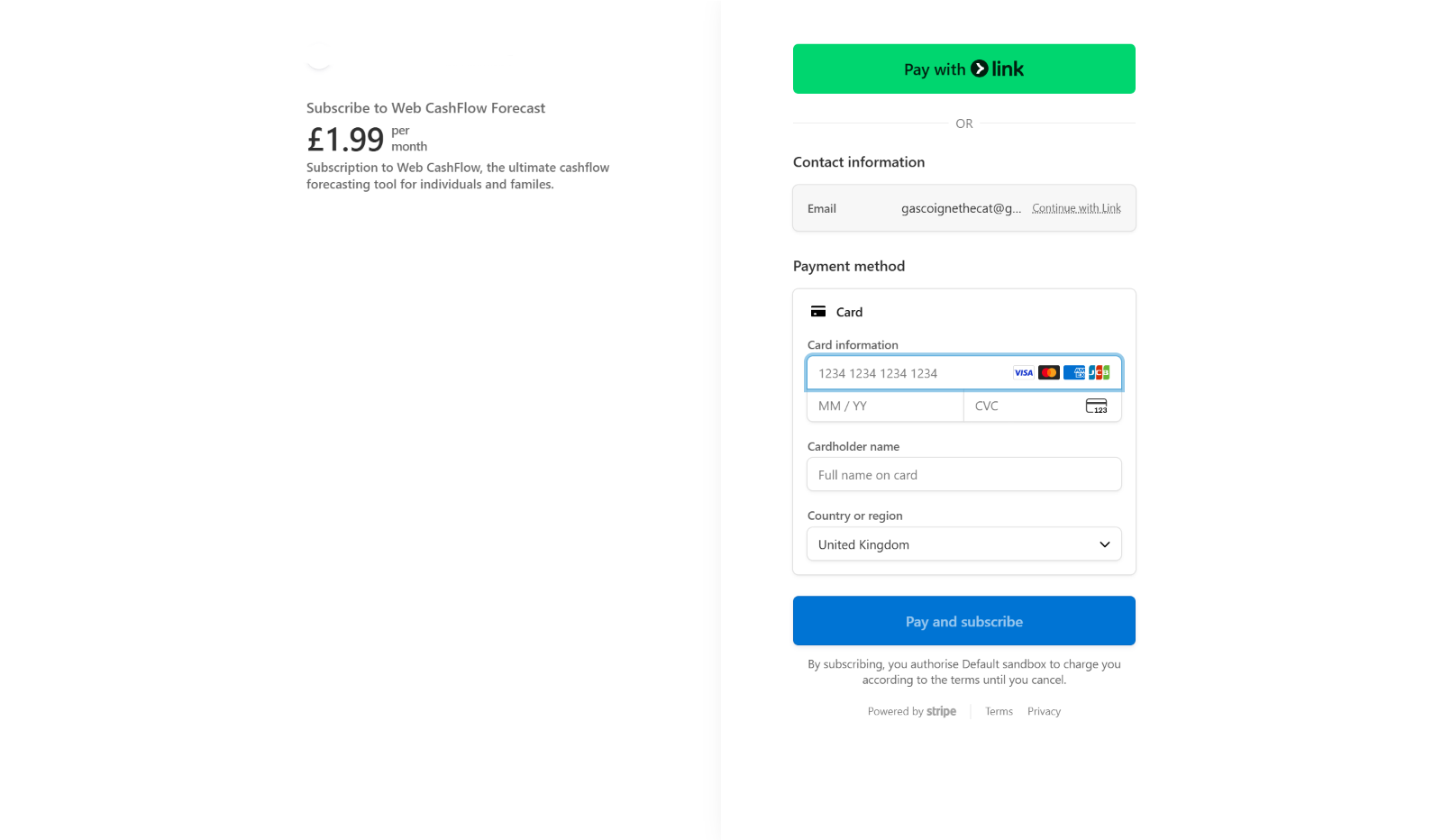 To subscribe, simply select whether you would like a monthly or annual subscription. In both cases you will be re-directed to a Stripe payment portal where you will need to enter your card details and click 'Pay and subscribe'.