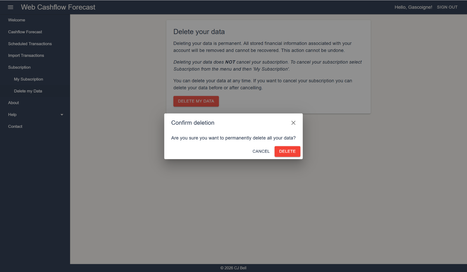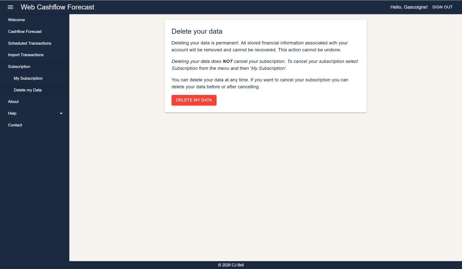 You can delete your data at any time by selecting 'Delete my data' from the menu. This will delete all your financial data but will NOT cancel your subscription. Please note that this action is irreversible and you will lose all your data.